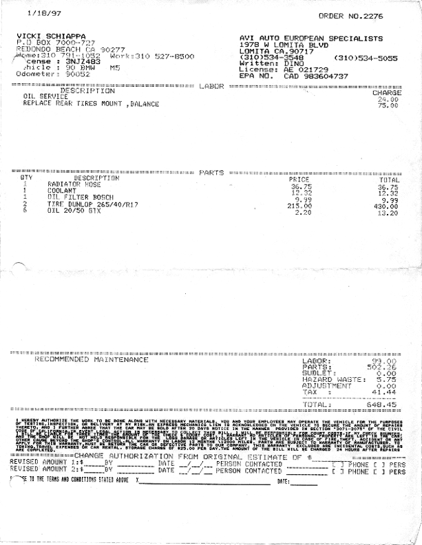 | 04-22-98 | Engine Oil Service | N/L | AVI Auto | Paul Shiappa | |