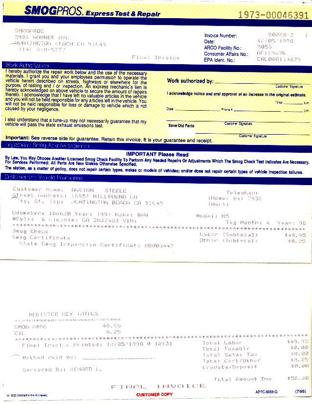 | 12-05-98 | Smog Check - PASS | Arco SmogPros Huntington Beach |