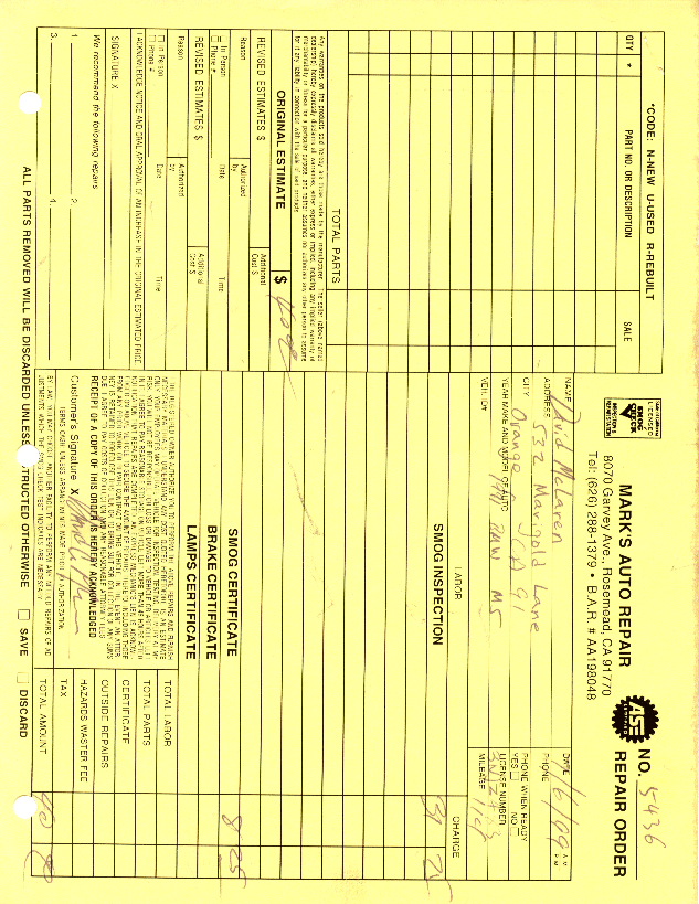| 07-6-99 | Smog Check - PASS | 114,829 | Mark's Auto Repair | David McLaren | |